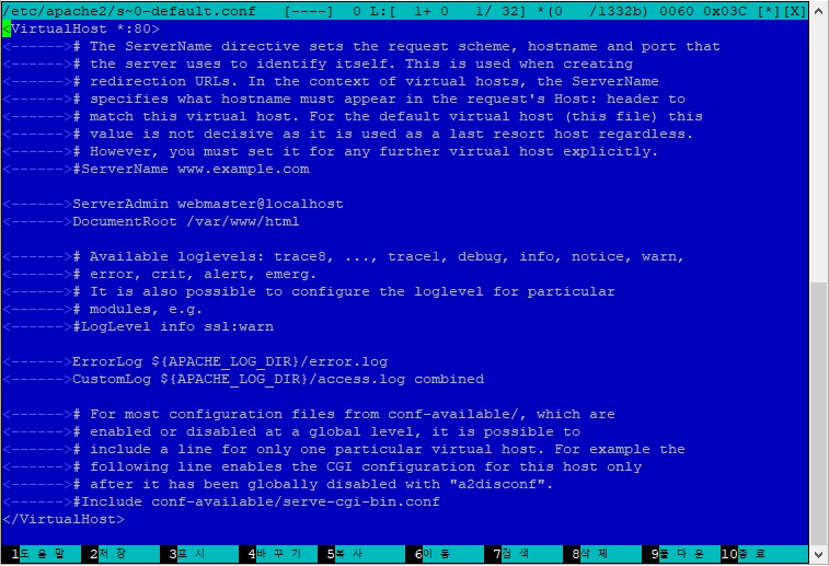 000-default.conf원본입니다. <------> 이 부호는 Tab 두번 누르면 나옵니다. 큰 의미는 없지만.추가할 내용은